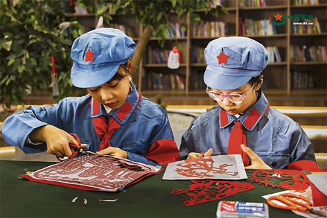 无锡市南湖小学剪纸社团学生正在创作红色主题剪纸作品。