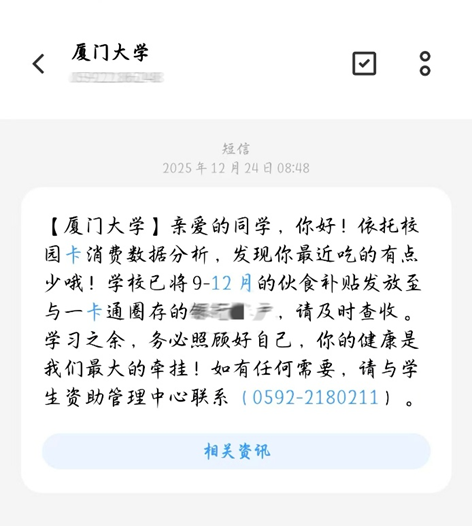厦门大学发放伙食补贴短信截图。受访者供图