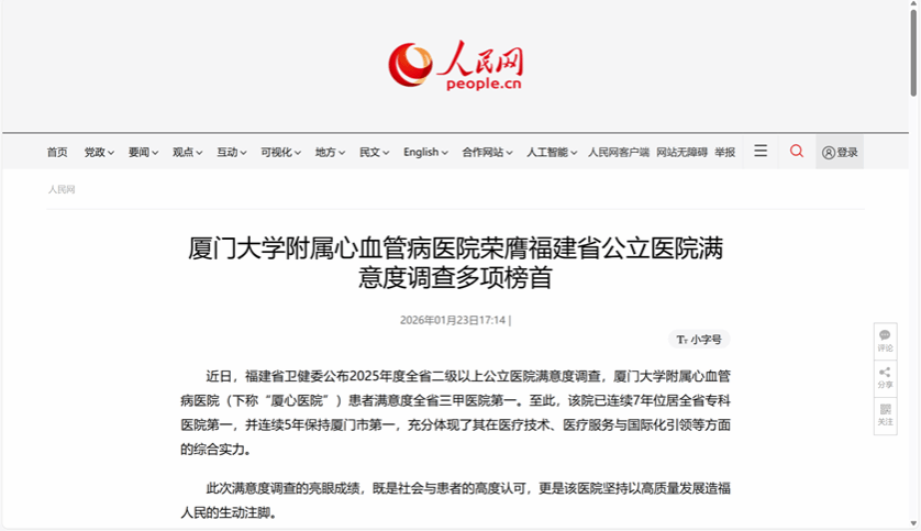 近日,福建省卫健委公布2025年度全省二级以上公立医院满意度调查,厦门大学附属心血管病医院(下称“厦心医院”)患者满意度全省三甲医院第一。至此,该院已连续7年位居全省专科医院第一,并连续5年保持厦门市第一,充分体现了其在医疗技术、医疗服务与国际化引领等方面的综合实力。