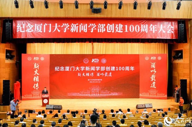 5日上午,厦门大学新闻传播学院新闻学部创建100周年纪念大会在厦门大学科学艺术中心举行。厦门大学校长张宗益,福建省委宣传部副部长叶雄彪,厦门大学新闻传播学院院长余清楚等领导,厦门大学各部处、各学院、各附属单位领导,离退休老同志,合作企业代表,捐赠个人及单位代表,各地院友会代表,海内外校友以及师生代表参加大会。大会以线上与线下相结合的方式进行,由厦门大学新闻传播学院党委书记曾铮主持。