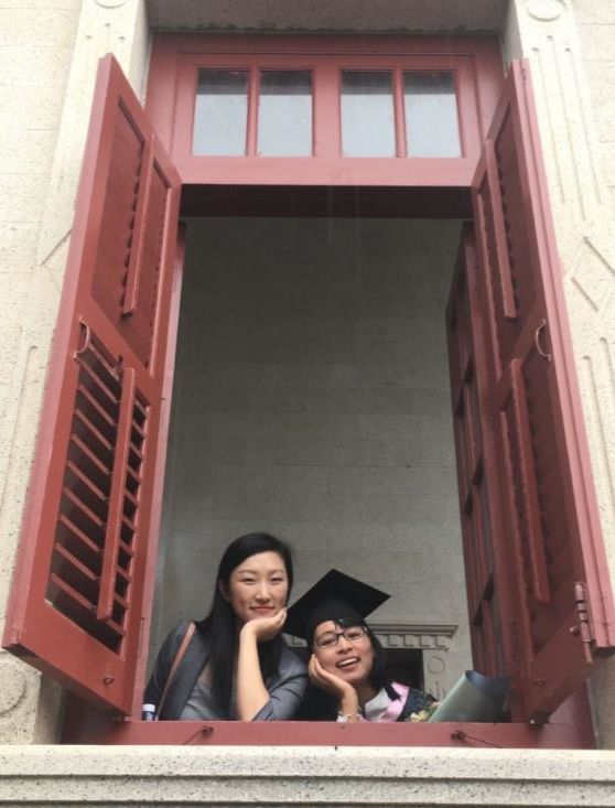 马小花与林杨琼在厦门大学建南大会堂合影。受访者供图
