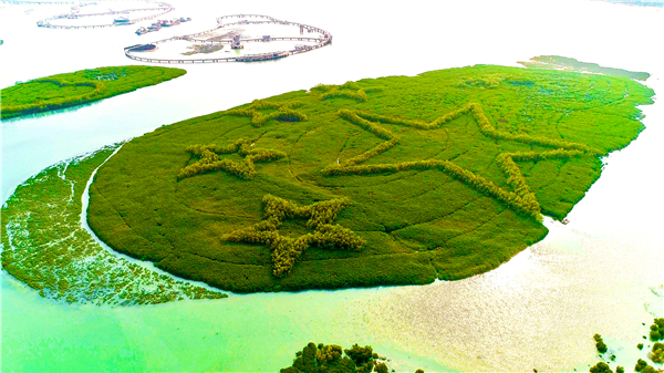 从无人机高空拍下视频中能清晰看到,在淡水和海水交界处的几个形状不同、大小不一的红树林小岛上,分布着英文字母“I”、爱心和五星红旗的图案,连在一起就是“我爱中国”。这是卢昌义和他的团队精心设计的,也成为这里独一无二的地标景观。