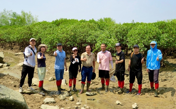 卢昌义(中)与红树林保护团队在泥泞的湿地进行考察