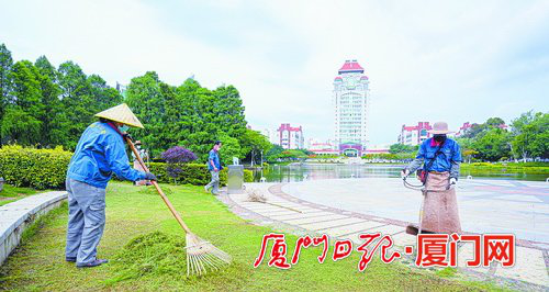 物业人员在厦大校园整理草坪。(本报记者 林铭鸿 摄)