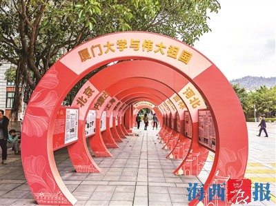 ◀“为吾国放一异彩——厦门大学与伟大祖国”展览汇聚45篇校地情缘系列文章。