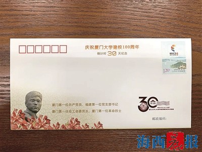 昨日的发布会上,厦门大学建校一百周年纪念邮票图稿和厦门大学100周年校庆倒计时30天纪念封亮相。校方介绍,中国邮政定于4月6日发行《厦门大学建校一百周年》纪念邮票一套1枚,邮票面值为1.20元。倒计时纪念封一套5个,此次亮相的为第四个,其他三个已在倒计时500天、300天、100天首发,纪念封以厦大“四种精神”及其作为代表的五位人物为主要元素。