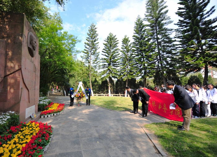 4月5日,厦门大学师生代表向罗扬才烈士雕像鞠躬。