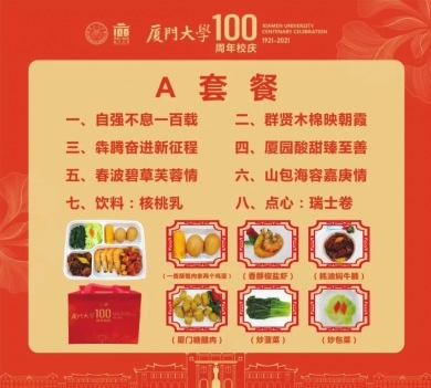 昨天中午,来到厦大的师生、来宾,只要刷卡100分钱(1元),就能享用校庆套餐。此次校方特意以“100分”寓意100年校庆,这笔钱最后将捐入厦门大学教育发展基金会,而且套餐的每道菜都有一个和厦大百年校庆有关的新名字。比如,“一香酥蟹肉条两个鸡蛋”寓意自强不息一百载;“蚝油焖牛腩”变出花样,叫做“犇腾奋进新征程”;“香酥椒盐虾”,在校庆套餐里,它叫“群贤木棉映朝霞”;“厦门糖醋肉”摇身一变,成为“厦园酸甜臻至善”;“葱烧大猪排”也有好彩头,意思是“栉风沐雨铸辉煌”……
