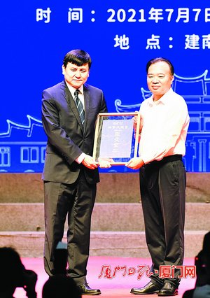 ▲厦大党委书记张彦向张文宏颁发群贤大讲堂纪念牌。