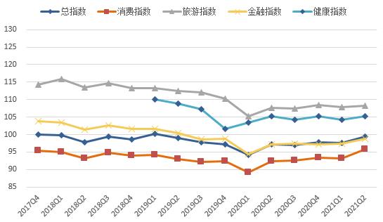 2021年第二季度海西地区金融、旅游、消费、健康信心总指数为99.40点,环比(较2021年第一季度,下同)上涨1.90点,同比(较2020年第二季度,下同)上涨2.31点。其中消费指数95.86点,环比上涨2.63点,同比上涨3.47点;旅游指数108.28点,环比上涨0.35点,同比上涨0.58点;金融指数98.88点,环比上涨1.43点,同比上涨1.70点;健康指数105.20点,环比上涨1.00点,同比上涨0.05点。