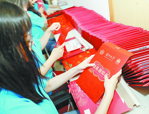 昨日上午10点,记者走进厦大招生办,整个办公室像打翻了红色染料,红的录取通知书、红的封装文件袋、红的邮封……整齐又热闹地摆放在桌案上、空地纸箱上,等待着被仔细封装好,寄往厦大新生手中。