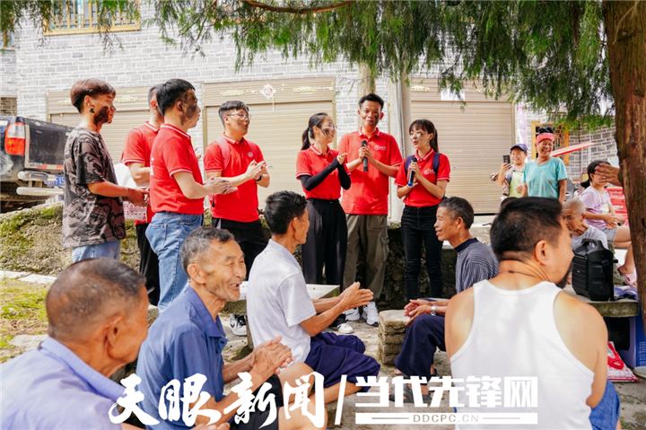 宣讲中,队员们不拘舞台、不限场合,走进一片片麦田地,穿梭于一座座吊脚楼,与村民们“打成一片”,一起交流学习党的发展历程,共同探讨乡村振兴。