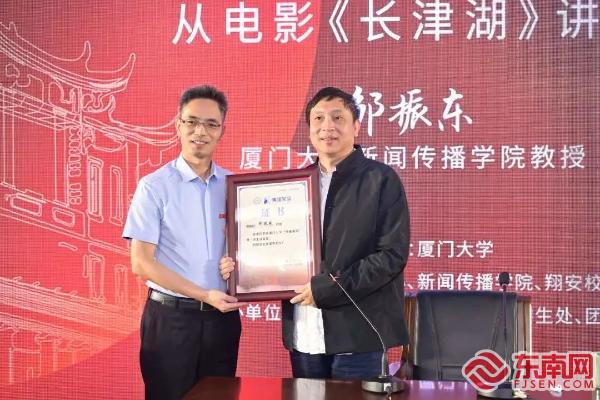 揭牌仪式后,“博雅茶座”第一场讲座,由厦门大学新闻传播学院邹振东教授应邀开讲。本次讲座主题为电影里的传播学——从电影《长津湖》讲起,现场知识点、笑点齐飞。