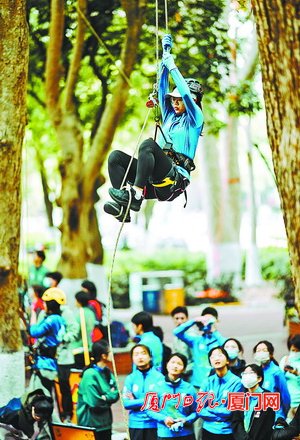 厦大体育教学部户外教研室主任郑达雄一直在纠正大家说法:是攀树,不是爬树——攀树需要借助绳子等工具爬树,完成上升、下移、旋转、飞跃等动作,还要戴头盔,防止树枝掉落。