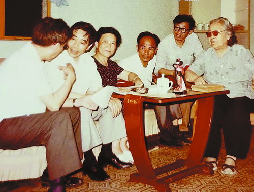 1984年,丁玲(右一)在厦门大学与庄钟庆(右三)等学者交流。