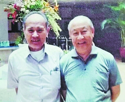 2006年,庄钟庆(左)在茅盾故乡桐乡市与茅盾儿子韦韬合影。