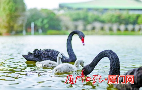 芙蓉湖靠近嘉庚广场旗杆处,又一对黑天鹅夫妇带着3只宝宝在湖中游弋,它们偶尔伸长脖子,发出细细的叫声。