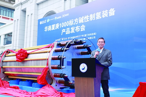 活动中,嘉庚创新实验室自主研制的1000标方碱性制氢装备正式落成并举行产品发布会。嘉庚创新实验室技术总监、华商厦庚董事长高小平介绍,该产品突破传统设计,性能达到行业领先水平,具有高效能、低成本等特点。