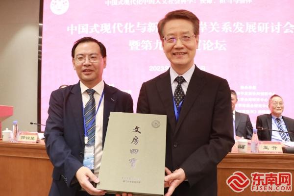 中国文化大学社科院与厦门大学台湾研究院在论坛上互换锦旗礼品(厦大台研院供图)