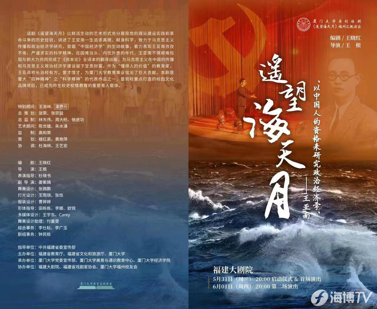 原创话剧《遥望海天月》是厦大重点打造的校园文化精品剧目之一,讲述了王亚南校长一生追求真理,献身科学,致力于马克思主义传播和政治经济学研究,并首倡“中国经济学”的生动故事。该剧对于高校传播马克思主义、厚植师生爱党爱国情怀和推动中国经济学建设具有重要意义,是教育系统深入开展学习贯彻习近平新时代中国特色社会主义思想主题教育的鲜活教材。该剧已于2020年10月在厦大首演,并于2021年12月在厦门嘉庚剧院进行专场演出,反响热烈,已成为厦大师生校史校情教育和美育实践的重要载体。