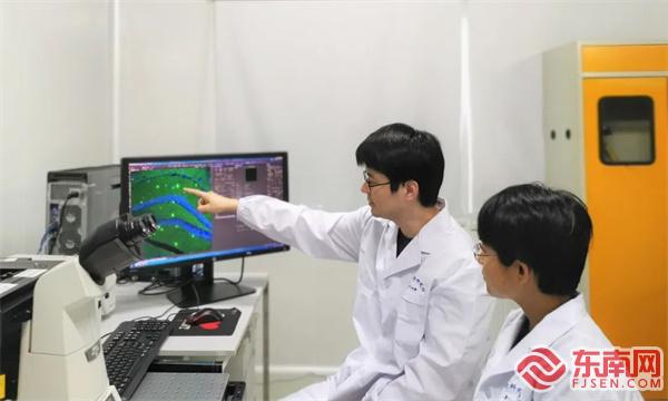 王鑫(左)与论文第一作者、博士生赵依妮在实验室讨论。(厦门大学供图)
