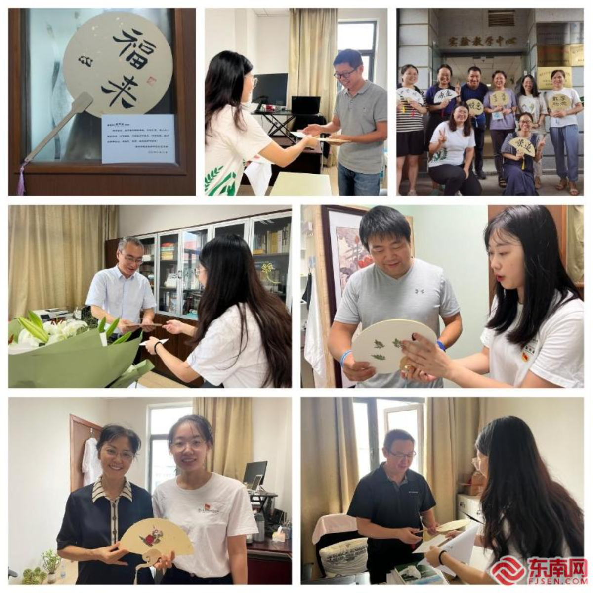 在敬上热茶后,学生们前往学院每一位老师们的办公室送上自制教师节礼物——叶拓感恩卡与压花书法团扇。叶拓感恩卡采用八闽园回收落叶,用叶拓的方式将大自然的清新定格在卡片上,不仅将秋天的美好封存于卡献给老师,还体现了厦大学子用实际行动传播生态、环保理念的风貌。厦门网讯(本网记者 沈伟彬 通讯员 欧阳桂莲) 9月10日是我国第39个教师节。日前,厦大环境与生态学院学生以扇寄情,谢师恩,向老师们致以节日的祝贺。