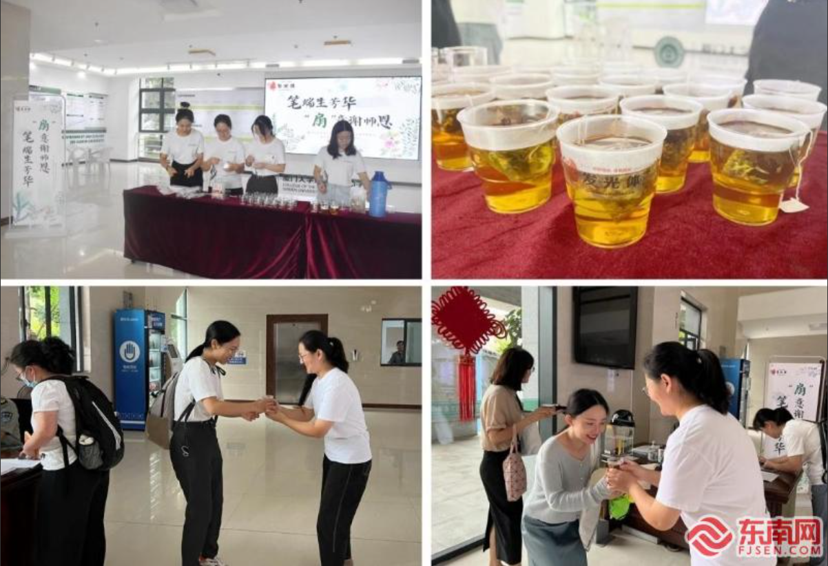 以茶为媒,敬恩师。以茶敬师之礼,自古有之。给老师奉上一杯清茶,既是对中华礼仪的传承,也饱含师生浓浓情意。活动当天,支部成员在金泉楼一楼大厅为老师们奉上一杯敬师茶,一齐向辛勤付出的老师们道一声“老师您辛苦了”,感谢老师们的谆谆教诲。