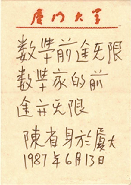 1987年,著名数学家、美国科学院院士陈省身来厦大讲学,并为厦大题词。(资料图/厦门大学数学学院 提供)