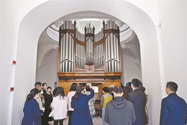 八卦楼附楼场馆大门口墙面以及大厅中,有别致的“风铃”装饰。据了解,它们是由旧管风琴改造而成,实现了变旧为宝。
