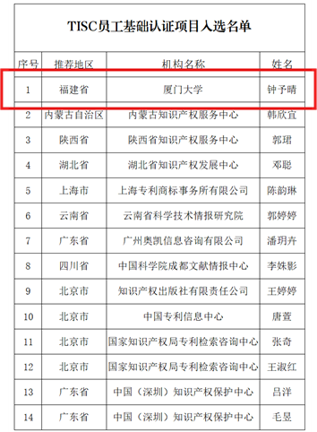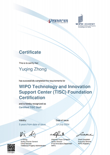 厦门大学图书馆钟予晴作为福建省TISC机构唯一候选人,于2023年11月至2024年5月参与WIPO组织的培训,顺利完成自主学习、直播课程、线上测试等环节,获得认证证书。此举彰显了厦门大学在知识产权信息服务专业领域的高水平和高素养,也体现了市校合作共建厦门大学TISC在知识产权信息服务人才培养方面的丰硕成果,为面向区域创新发展的高质量知识产权信息公共服务提供了有力支撑。