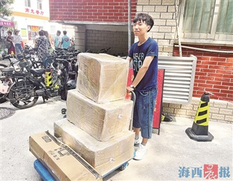 记者在厦大思明校区内看到,邮政、顺丰、菜鸟等“安营扎寨”,遮阳棚下,被褥、床垫、衣服、鞋帽、水桶、衣架等快递堆得满满当当,这些绝大部分都是新生的“家当”。记者体验了一下,普通快递重量在二三十公斤居多,三四十公斤的大件快递也不少。