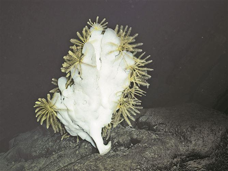 当然,在深海中寻找冷水珊瑚的过程,也有惊喜。让孟雅冰印象深刻的,是海底里的海绵与海百合,“黄色的海百合附着在白色的海绵上,这说明海绵可以在深海里为其他生物提供栖息场所。”