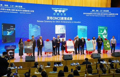 会上,ONCE国际大科学计划发布了教育成果,包括教育改革及前沿学科系列教科书,以及教学改革本研一体化课程《宜居地球》的30个语种版本,展示了其在教育领域的丰硕成果。