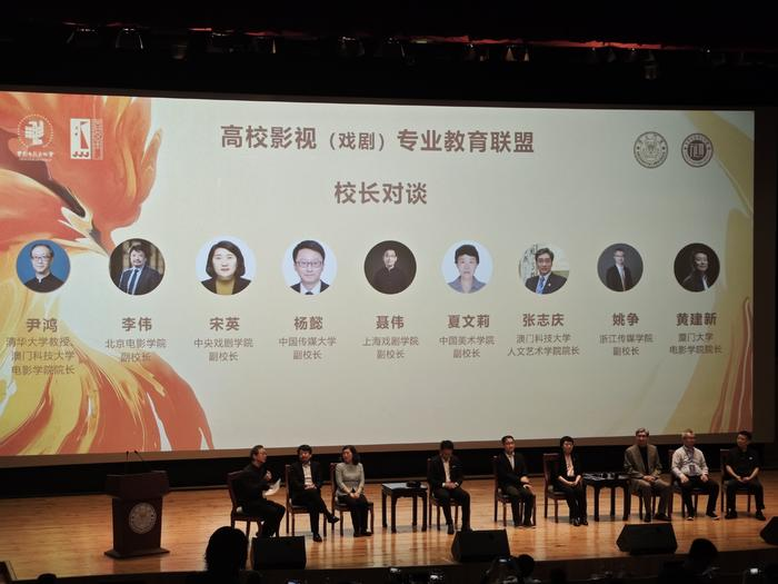 现场还举办了“高校影视(戏剧)专业教育联盟校长对谈”环节,由清华大学新闻与传播学院教授、澳门科技大学电影学院院长尹鸿主持。北京电影学院副校长李伟、中央戏剧学院副校长宋英、中国传媒大学副校长杨懿、上海戏剧学院副校长聂伟、中国美术学院副校长夏文莉、澳门科技大学人文艺术学院院长张志庆、浙江传媒学院副校长姚争、厦门大学电影学院院长黄建新围绕影视教育的创新合作、资源共享、产教融合和AI技术革命带来的影响等话题展开了深入研讨交流。