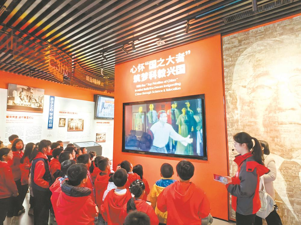 福州大学卢嘉锡教育馆的学生讲解员为小学生讲述科学家故事。