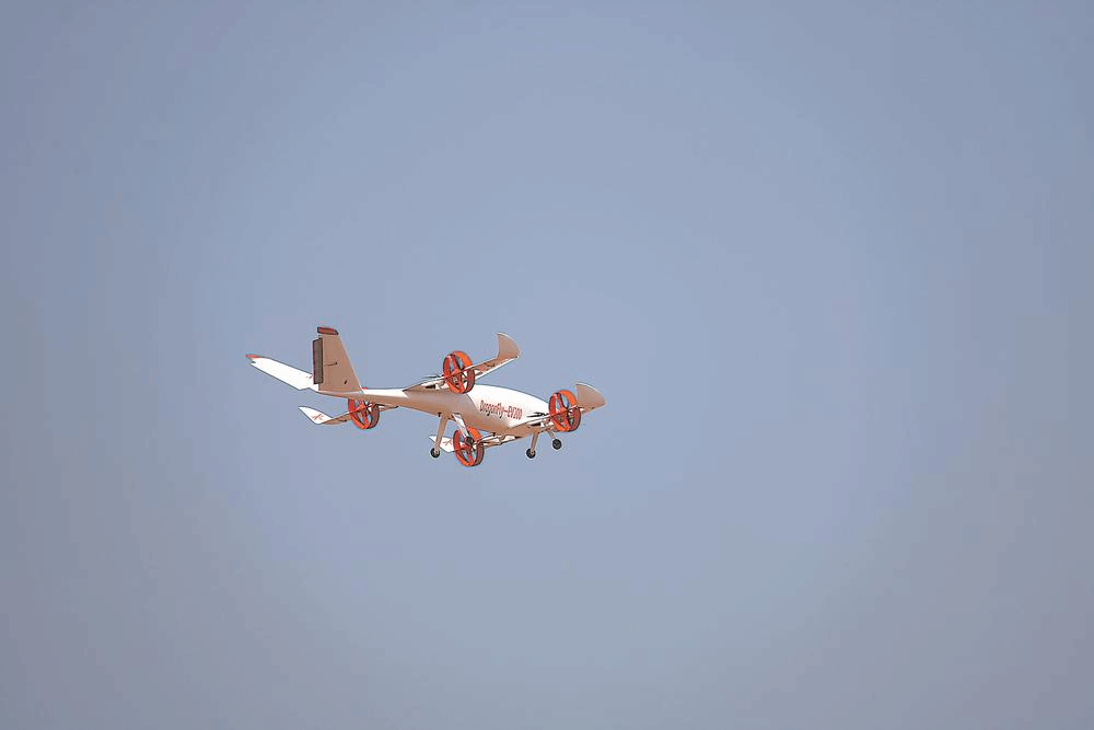 明星产品DragonFly-EV200电动垂直起降飞行器(eVTOL)正在进行涵道倾转飞行测试。