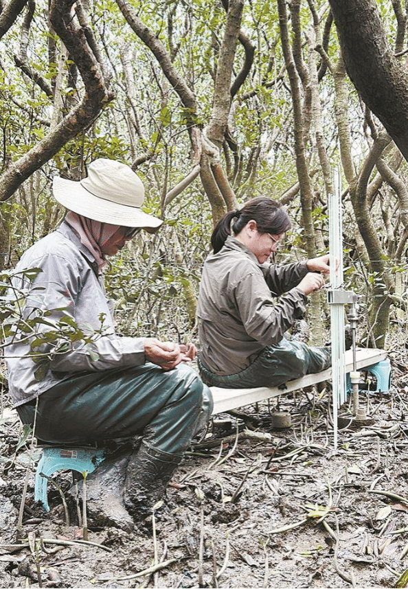 陈鹭真(右)和学生在红树林开展蓝碳监测。