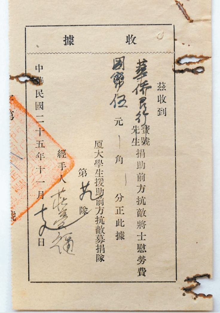 1936年11月,厦大学生援助前方抗敌募捐收据。(陈亚元 供图)