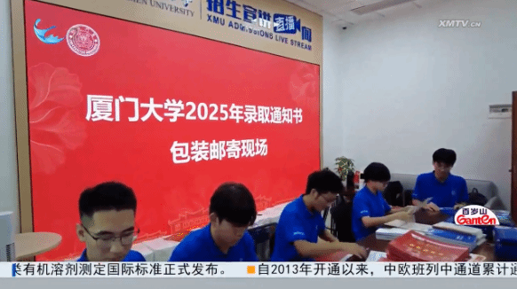记者 肖鑫:在我手上的这份就是今年厦门大学的录取通知书,这里是厦大的颂恩楼。可以看到,在我身旁同学们正在紧张地忙碌着,包装邮寄今年的录取通知书。