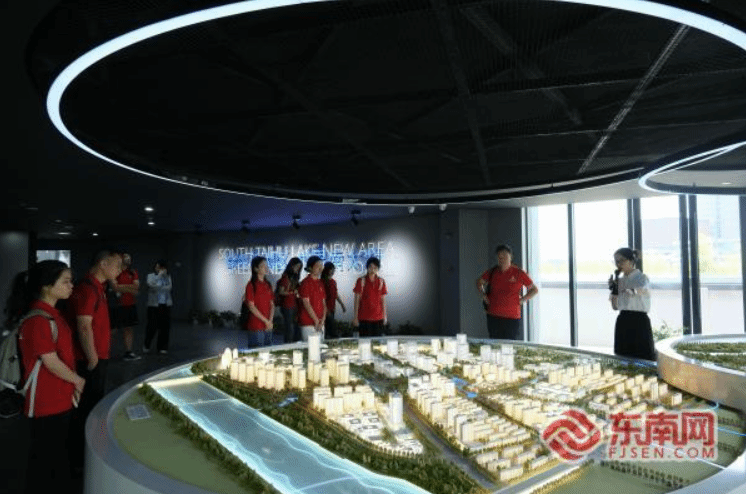 南太湖新区作为省级新区,是湖州融入长三角一体化发展的重要平台。在南太湖未来城展示馆,实践队在工作人员的讲解下,了解到南太湖新区以“3+1+N”绿色产业集群为核心,重点发展新能源、半导体及光电、生命健康三大制造业,以休闲旅游为特色,结合溇港水利智慧与海绵城市技术,着力推动生态保护与产业发展齐头并进,现已成为湖州经济发展的新增长极。