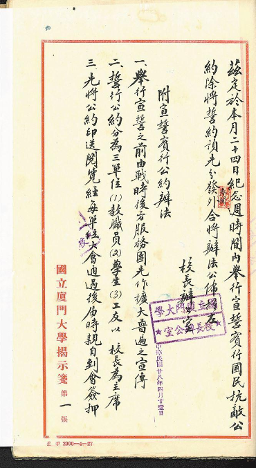 1939年4月21日,厦大校长办公室发布举行宣誓实行国民抗敌公约。