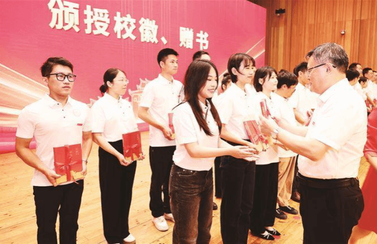 在校领导、学界泰斗的迎接下,新教职工们正式加入厦大大家庭,踏上他们在“南方之强”的崭新旅程。典礼仪式上,校领导为每位新教师赠送校徽,全体新教师共同许下“成为四有好老师”的誓言。