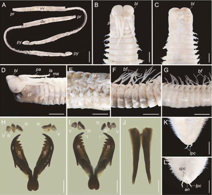 福建岩虫的形态特征,图示分别为整体(A)、体前部(B—E)、体中部(F)、体后部(G、 K、 L)及颚器(H—J)。