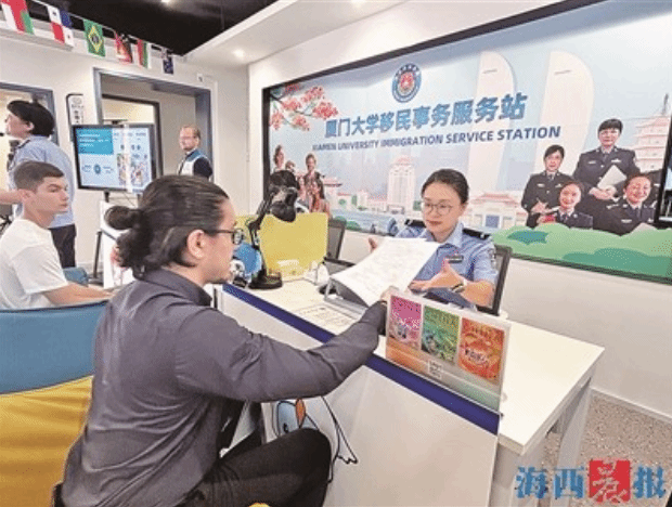 昨日,全省首个服务外籍专家和外国留学生的校园移民事务站点——厦门大学移民事务服务站在厦门大学思明校区揭牌,外籍师生不出校门即享“一站式”出入境服务。
