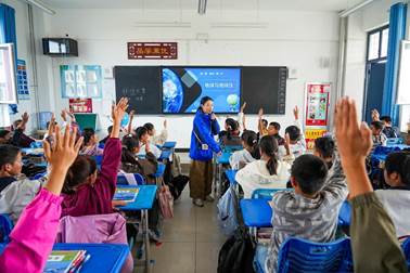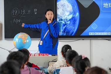 林楚韩正在讲授地球与地球仪的知识。课堂气氛活跃,学生们踊跃举手,积极回应老师的提问