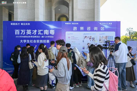 25日下午,“百万英才汇南粤”2025年N城联动秋季招聘活动走进厦门大学,以专场双选会、特色互动体验等多维形式,精准对接厦门大学学科优势与广东产业需求,为福建学子数千个岗位。