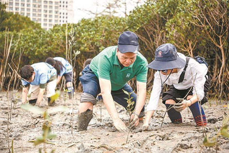 卢昌义(前左)在红树林种植活动中。