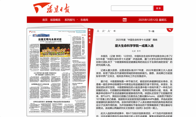 12月9日,中国科协生命科学学会联合体公布了2025年度“中国生命科学十大进展”评选结果,厦门大学生命科学学院林圣彩院士团队关于“卡路里限制促进健康延寿的效应分子及其机制的发现”的研究成果入选。