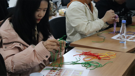 活动中,师生以传统蛇结为基础技法,通过不同组合勾勒出小篆“马”字的轮廓。彩线交错、渐渐成形,一个个寓意吉祥的“马”字结在指尖诞生。同学们在协作与分享中,深化了对汉字美学与手工技艺的双重理解。