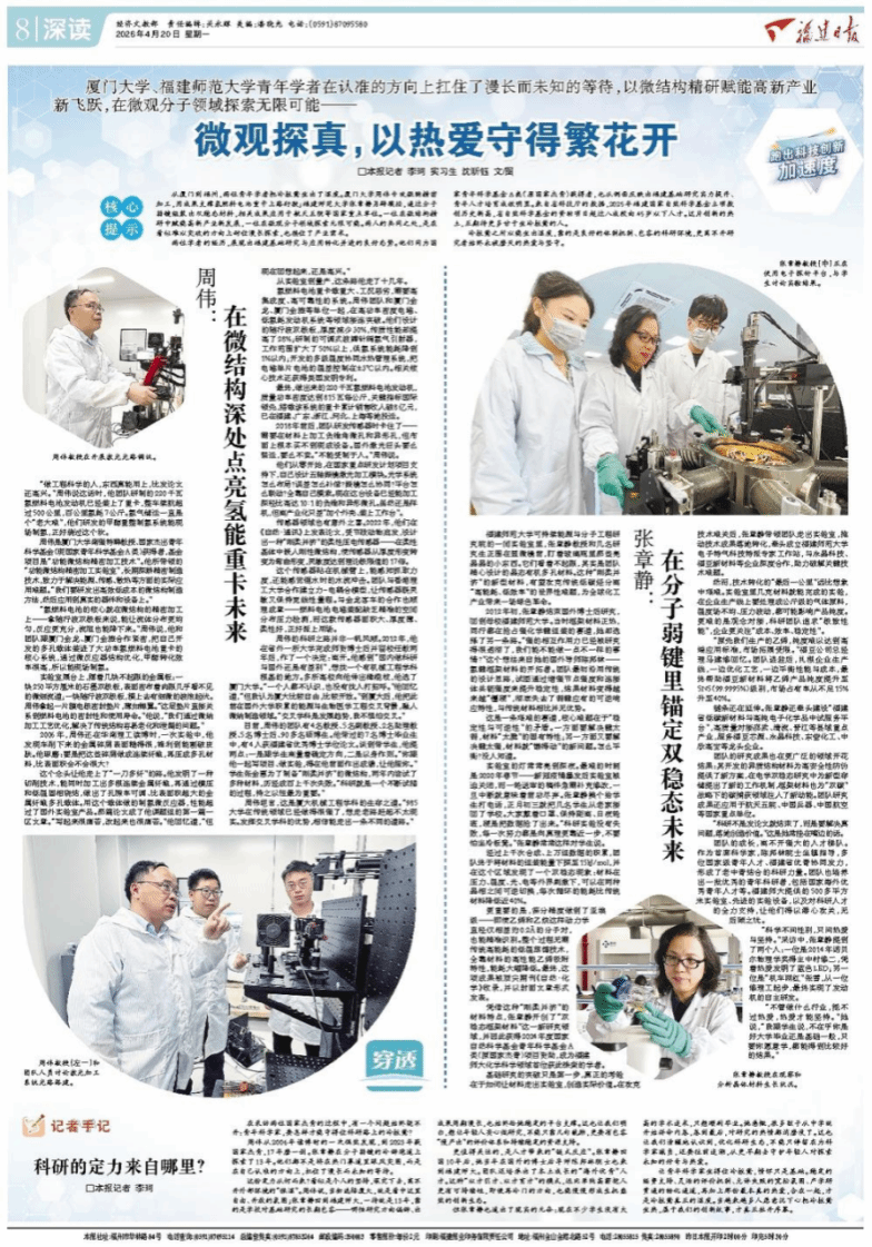 从厦门到福州,两位青年学者把冷板凳坐出了温度。厦门大学周伟专攻微纳精密加工,用成果支撑氢燃料电池重卡上路行驶;福建师范大学张章静另辟蹊径,通过分子弱键组装出双稳态材料,相关成果应用于航天五院等国家重点单位。一位在微结构精研中赋能高新产业新发展,一位在微观分子领域探索无限可能。两人的共同之处,是在看似难以突破的方向上耐住漫长探索,也接住了产业需求。